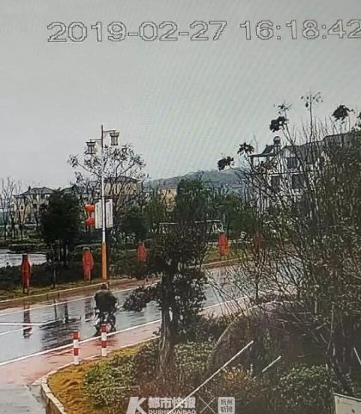 今年2月27日下午4点20分左右,天空下着小雨,沥青路面湿滑,设于衢江区莲花镇西山下村一路口的监控画面里,一辆二轮电动自行车由左向右横驶过路口,骑该车的是张女士,当时她穿着有帽子的雨衣(未戴头盔),骑行在路肩与机动车道白色分界线靠机动车道内侧约二三十公分的地方。